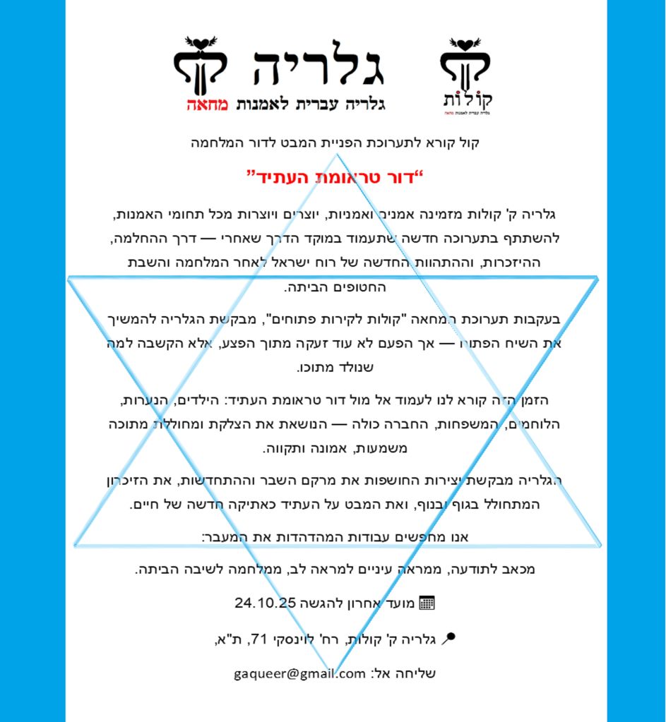 קול קורא לתערוכה "דור טראומת העתיד" בגלריה קולות מחאה.