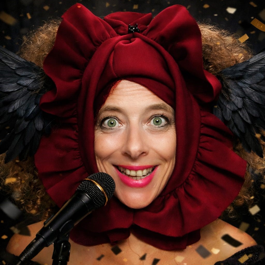 האמנית האלמונית, עורבנית-חקיינית טראנסיס – העורבנית־החקיינית – ניצבת בין מאזניים מתנדנדים.